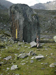 | Bright skies and sunshine accompanied us on the way to the five peaks. The 'Geschriebene Stein' to the right is an eight meter tall rock with graffiti dating back to 1489. It has been suggested that this monolith marks a place of worship in ancient times. | |||