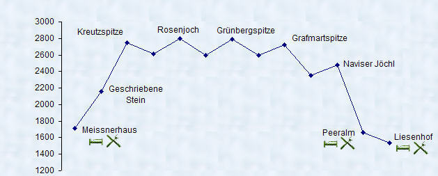 | 9 hours of walking approximately 16 km. Five peaks along the way with a 15 m cable assisted section on the descent from the Kreutzspitze and easy scrambling at the Rosenjoch. Path along the peaks quite exposed in sections. Long downhill at the end | |||