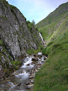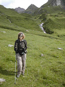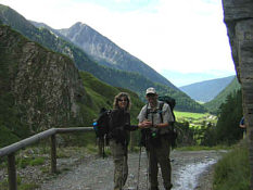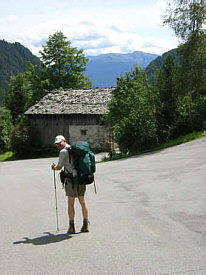 | We followed the trail next to the Valser Creek, soon reaching the hamlet of Vals. Here, we followed a little road to the right of the creek, taking left turns whenever there was a junction to stay near the water. This path was not marked, the marked trail followed the paved road! Eventually, however, even the little path dead-ended into the road. For about 20 minutes we walked along the road and almost missed our turn onto the old road and away from the traffic as the markings were almost invisible! The old road steeply meandered toward the valley and we could see the elevated bridges of the new road above and on the other side of the creek. |