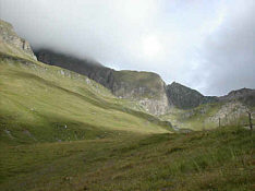 | Overcast skies with low clouds greeted us in the morning. During the night a storm had passed through (again!) and the grass was wet and lush. On our way towards Fane Alm along the Valser Creek, lots of dayhikers were coming up on their way to the Brixnerhütte and Wilder See. The rock outcrops along the trail were full of beautiful gneiss augen. |