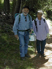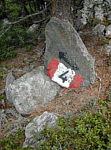 few hours, it's a walk in the woods. An older couple was coming dwon the path, well, not quite the path; it seeemed they were off a bit in the forest. Curious, we asked them if they were looking for mushrooms. 'No, pintura' the man said and pointed to his paint bucket with red and white paint. And the trail was well and freshly marked from here on. Above the treeline, alpine azaleas were in full bloom. |