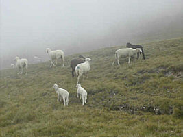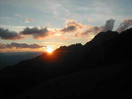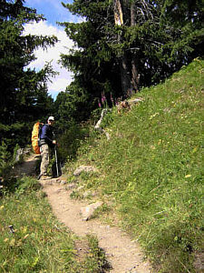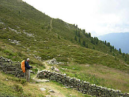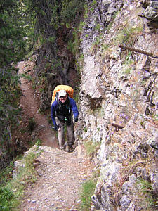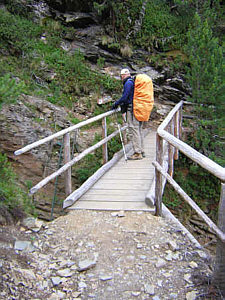 | Thick fog greeted us this morning. After waiting awhile we set out despite the mist. As soon as we had descended about 100 meters, we were below the clouds and soon enjoyed bright sunshine. The short cable sections we encountered here and there mostly served as decoration and remained unused by us. A bridge had replaced a scrambling section through a gully. | ||