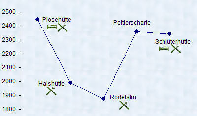 An medium difficulty 5 hour hike, some short sections are narrow and have cables like handrails, along the side. A little scrambling required on the climb to Peitlerscharte, trail is well marked. | ![]() |