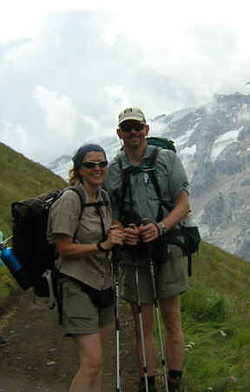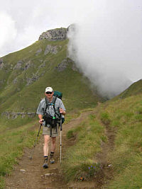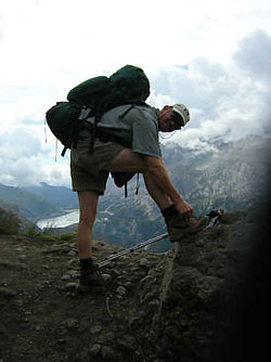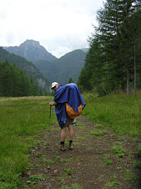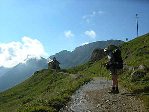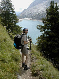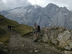 | All along the fairly level path, beautiful views of 'Queen Marmolada' and its glaciers abound. Eventually, Lake Fedaia becomes visible, and soon the trail descends all the way down. The marked path points along the road on the left side, but crossing the dam and following the old road on the opposite side is much more scenic. Just after Refugio Passo Fedaia, the marked trail points down the heavily trafficked main road. Luckily we had just met up with a couple german guys and a german guidebook suggesting one follows the skirun to the right. This turned out to be a pleasant walk on a faintly trodden path through meadows and lightly forested areas, but completely unmarked! |
