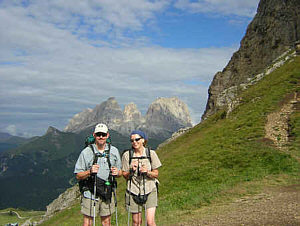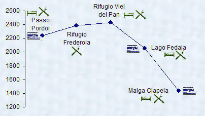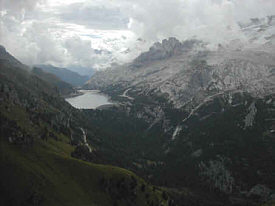 Easy 5 hour hike around the northwestern side of the Marmolada. Well marked trails to Lago Fedaia; the Viel de Pan (way of the bread) is very popular, start early to avoid the crowds. Long downhill to Malga Ciapela, marked trail follows the road, unmarked follows the skislopes through meadows and forest (much prettier). | ![]() |
