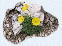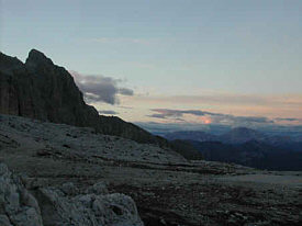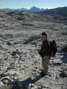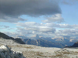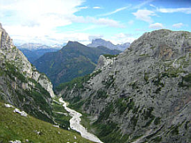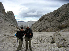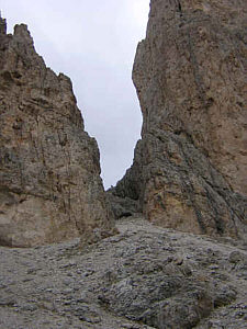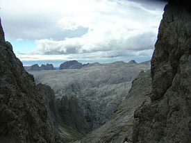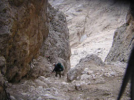 After the last cable section and negotiating 'fat mans' squeeze' with our packs we descended to the Val Comelle. Karstic rocks here with little patches of green were home to marmots, whose shrill whistles we heard. We wondered where they obtained their water as it was extremely dry and desolate. | ![]() |